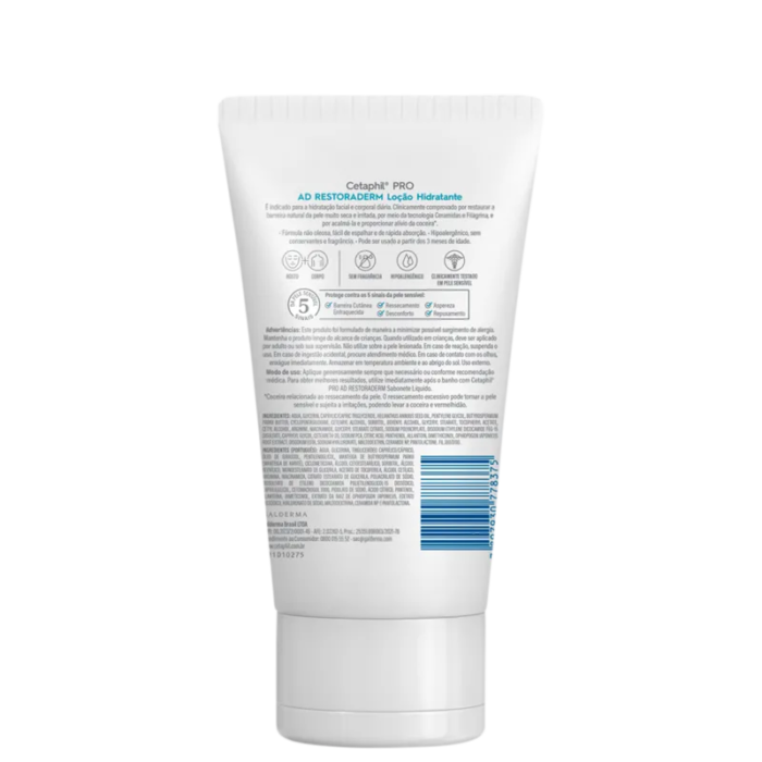 Loção hidratante hipoalergênica e corporal para pele muito seca, sensível ou atópica. Além de hidratar, Cetaphil Pro AD Restoraderm acalma e alivia o prurido da pele atópica resturando a barreira cutânea. Também ajuda a restabelecer o equilíbrio da pele e reforça seu sistema de defesa.