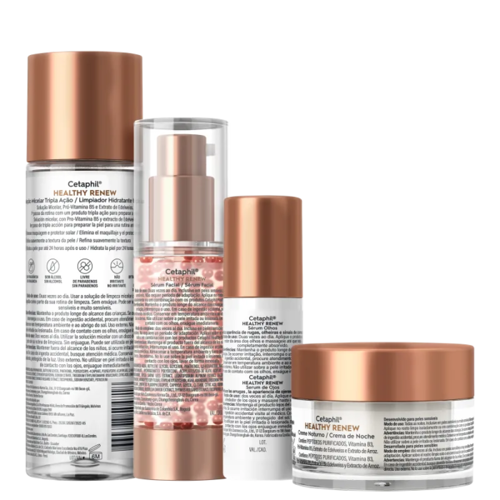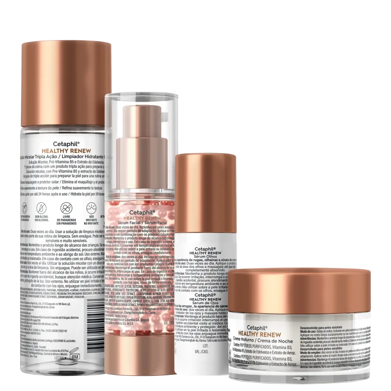 Kit Cetaphil Healthy Renew (4 Produtos) Kit de tratamento para todos os tipos de pele. Cetaphil Healthy Renew proporciona pele rejuvenescida e com aparência mais saudável. O Kit Cetaphil Healthy Renew traz água micelar, sérum facial, creme facial noturno e sérum para área dos olhos. Um cuidado completo para deixar a pele revitalizada e radiante. A fórmula ajuda a reduzir rugas e linhas finas, e melhora a luminosidade, a firmeza e a elasticidade da pele. Conta com ativos que protegem e restauram a barreira cutânea e promovem ação calmante, clareadora, anti-inflamatória, antioxidante e antiglicante. Assim, atuam contra os 5 sinais da pele sensível: barreira cutânea enfraquecida, ressecamento, aspereza, desconforto e repuxamento.